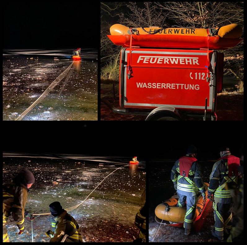Am 20.02.2025 konnten wir auf Grund des Wetters endlich mal wieder eine praktische Übung auf dem Eis machen. Für die Rettung auf dem Eis haben wir unser Schlauchboot mit Eisschlitten verwendet. Das Schlauchboot wird gesichert mit der Hilfe einer Rettungsleine. Der Trupp der rausfährt hat zur eigenen Sicherheit immer eine Schwimmweste an. Um sich fortzubewegen haben wir Bootshaken, mit denen wir uns bis zur verunfallten Person herantasten können. Für den Rückweg zieht ein Trupp vom Land das Schlauchboot mit Eisschlitten an der Rettungsleine zurück. Eine andere Methode zur Eisrettung ist über Leitern möglich. Wir haben zwei Steckleiterteile nebeneinander auf das Eis gelegt. Auf das eine geht ein Truppmann drauf und krabbelt bis nach vorn und schiebt zeitgleich das zweite Steckleiterteil mit nach vorn. Dann wechselt er die Leitern und krabbelt auf dem anderen wieder bis nach vorn und nimmt ebenfalls das andere Steckleiterteil mit. So wird sich nach vorne bewegt, bis man das Ziel erreicht hat. Diese zwei Methoden wurden Ausführlich auf dem Kalksee geübt, sodass wir unsere Kenntnisse auffrischen konnten.