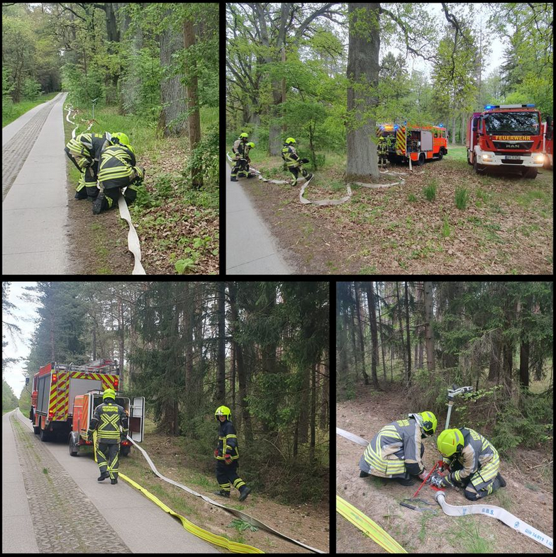 Am 8. Mai fand im Rheinsberger Ortsteil Rheinshagen eine Übung des 2. Waldbrandzuges OPR im Rahmen des regulären Dienstes statt. Als Übungssenario diente ein neu bepflanztes Waldgebiet, in dem der zuständige Förster junge Kiefern gesetz hatte. Diese Fläche wurde symbolisch als Brandherd angenommen und musste von den Einsatzkräften "gelöscht" werden. Zur Wasserentnahme wurden durch die Feuerwehreinheit Rheinsberg zwei Entnahmestellen an offenem Gewässer eingerichtet. Das Löschwasser wurde klassisch mit der Hilfe von Saugleitungen und einer Feuerlöschkreiselpumpe aus dem angrenzenden Rhin entnommen. Zusätzlich kam eine Schwimmpumpe zum Einsatz, um Wasser aus dem Rhin in ein offenes Becken (Bassin) zu fördern. Dieses diente der Speisung des Kreisregnersatzes der Feuerwehreinheit Gühlen-Glienicke. Weitere Einheiten aus Linow, Flecken Zechlin, Zühlen, sowie Einsatzkräfte aus Rheinsberg arbeiteten im Waldgebiet zusammen, um das angenommene Feuer einzudämmen und zu löschen. Insgesamt zeigte sich die Führungsebene des 2. Waldbrandzuges sehr zufrieden mit dem Ablauf und bewertete die Übung als gelungen und lehrreich.