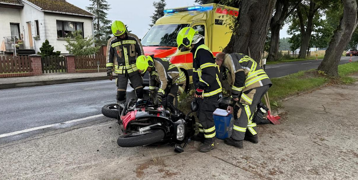 Einsatzbericht: Wir wurden zu einem Verkehrsunfall gerufen. Ein Motorrad kollidierte mit einem Transporter. Beim Eintreffen auf der Dorfstraße wurde der Motorradfahrer bereits durch einen zufällig anwesenden Rettungssanitäter versorgt und wir konnten uns um die Sicherung der Einsatzstelle, die Fharzeuge und die ausgelaufenen Betriebstoffe kümmern.